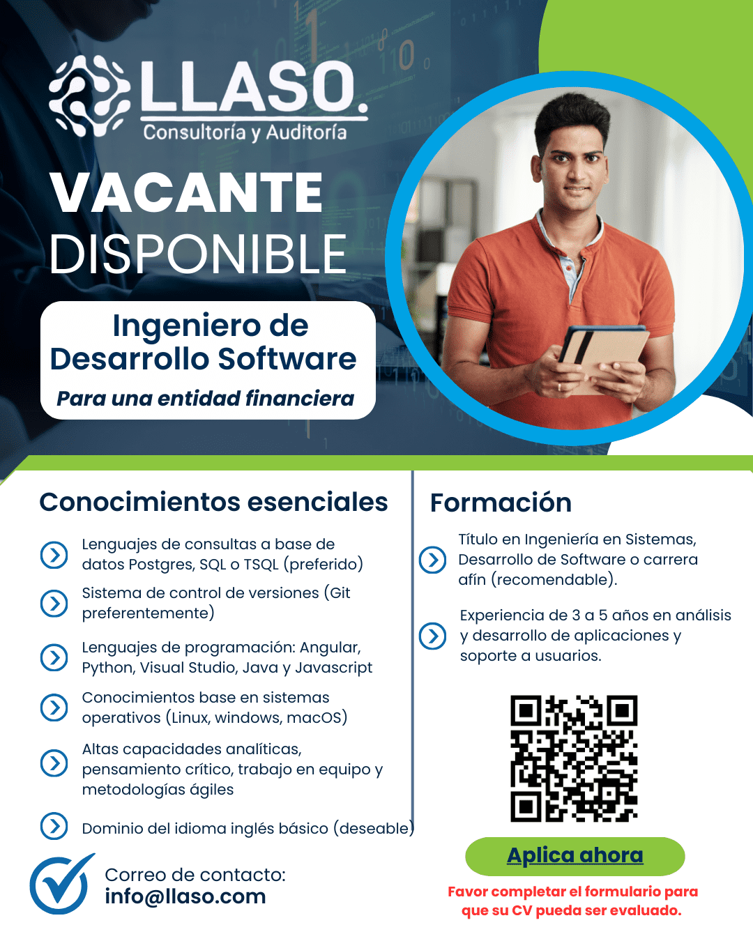 En LLASO, creemos en el talento y el potencial de las personas. Por eso, esta Bolsa de Empleo, es un espacio donde podrás aplicar a oportunidades laborales alineadas con tu perfil e intereses. Aquí encontrarás vacantes disponibles como la opción de postularte a la bolsa, lo que nos permitirá considerarte en futuras oportunidades que se ajusten a tu perfil e intereses.